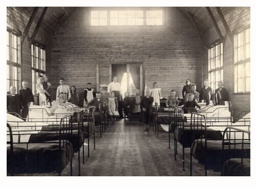 Interiör från Kustsanatoriet Apelviken år 1905. Sjuksal i den gamla träpaviljongen. En grupp patienter och personal står vid väggen. Solljuset var viktigt så byggnaden hade stora fönster, även i gaveln.