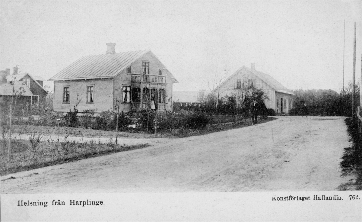 Brevkort, "Helsning från Harplinge" tillverkat före 1905 då meddelandet måste skrivas på framsidan. Fotot visar några bostadshus vid en väg. Huset närmast i bild har ovanligt nog sin entré med veranda och balkong på gaveln. En kvinna står på verandan. Bortom tomten ses en klunga män, en pojke står bredbent i vägkorsningen och en man kommer gående på vägen till vänster i bild.