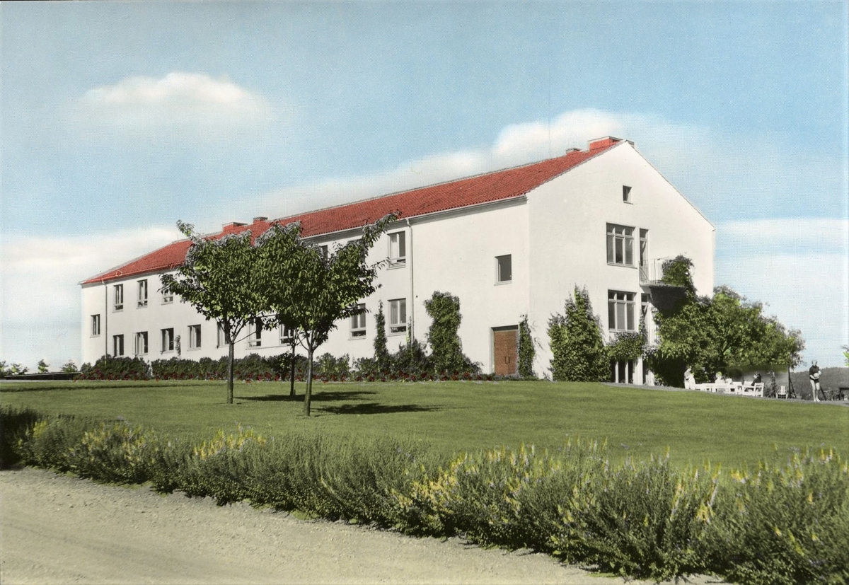 Vykort, "Plönninge lanthushållsskola, Harplinge." Handkolorerat. Till höger om byggnaden sitter några personer i en trädgårdsmöbel och en kvinna står med en boll.