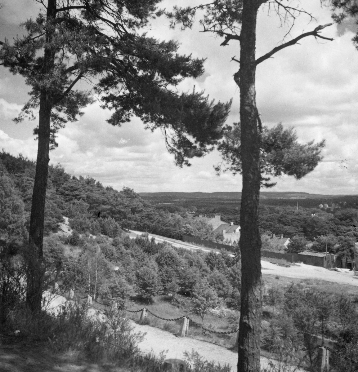 Utsikt från Galgberget i Halmstad. Vägräcket utgörs av stenpollare med kedjor emellan.