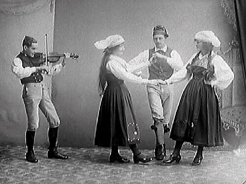 Folkdans. En fiolspelare och en man inbegripen i dans med två kvinnor. (Se även bilderna MR2_1690, 1699, 1735)