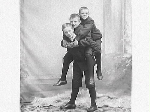 Mathildas systersöner, barn till äldsta systern Maria. William Bäckström bär Charles Bäckström på ryggen, som i sin tur har Robert Bäckström hängande på ryggen.