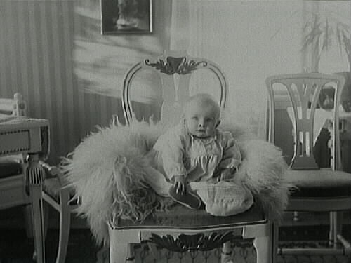 Flickporträtt. Rådman Oskar Mellins dotter Britta sitter på en stol, omgärdad av ett fårskinn som stöd.