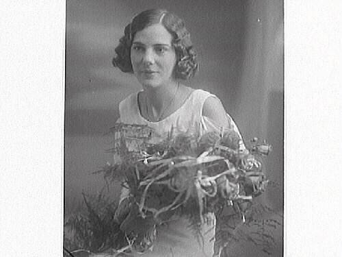 Kvinnoporträtt. Brud med ondulerat hår och stor brudbukett.