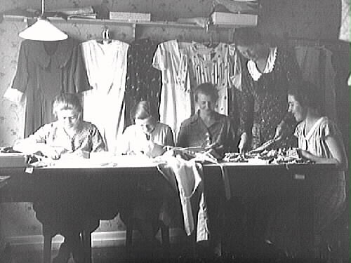 Sömmerskor. Ester och Jenny Nilssons syateljé i Stålbåges hus, Prästgatan i Varberg. Jenny står vid bordet där sömmerskorna sitter och bakom dem hänger klänningar på rad.