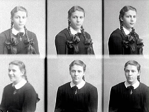 Sex olika porträtt sammanfogade till en påsiktsbild av en mörkt klädd flicka i flätor och med kors om halsen; troligen ett konfirmationsfoto.