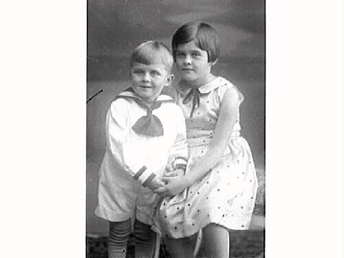 Liten syster och bror håller hand hos fotografen. Pojken bär sjömansdräkt och flickan en prickig klänning.