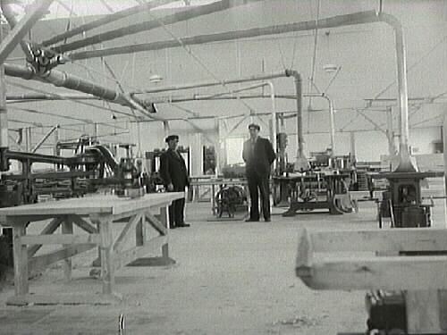 Interiör från snickerifabriken Varbergs Träförädling. Två män står bland maskinerna i centrum av bilden. Bild 2 visar männen i närbild.