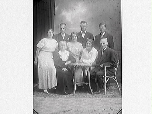 Familjebild med ett äldre par och sex yngre vuxna. Beställare: Adolf Andersson, Åhs 13 Pixsjö, Tvååker.
