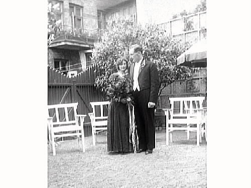 Brudpar. Bröllopsbild. Mejerist Eriksson med fru fotograferade bland stolar på en innergård.