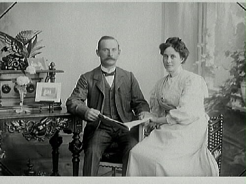 Parporträtt. Handlanden Ernst Rylander med fru. Ateljéfoto där fond och rekvisita ska ge illusionen av hemmiljö.