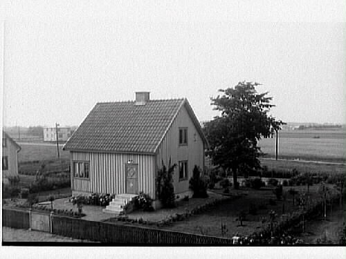 Exteriör av bostadshus och trädgård tillhörigt en herr Ljung i Träslöv. I bakgrunden ett jordbrukslandskap.