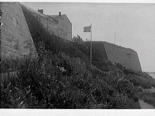 Varbergs fästning, den med växtlighet bevuxna fästningsterrassen med en hissad flagga i stark vind. Bilden tagen från nordväst.