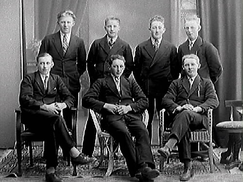 Mönstringsfoto av sju ynglingar. Två av personerna är från Tvååker och heter Olof Karlsson respektive Bror Karlsson.