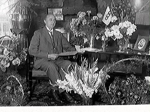 Carl Bartholdsson, en av cheferna på Monark, fyller 50 år. Han sitter bland sina gratulationsbuketter och på bordet även en Odd Fellow-flagga.