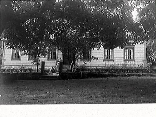 Villafasad med liggande träpanel, skymd bakom lövverk.