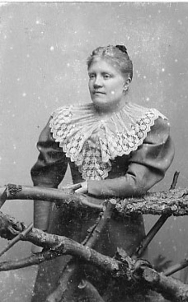 Kvinnoporträtt av Anna Karlson som var husföreståndarinna hos August Bondeson (1854-1906), författare, folklivsforskare och läkare. Bondeson växte upp i Vessigebro men bodde senare i Göteborg.