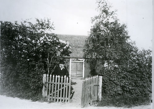 Författaren, läkaren och folklivsskildraren August Bondeson vid grinden framför Fågelboet, hans föräldrahem i Vessigebro. Tomten hägnas av syrénhäckar och en ung björk står vid grinden.