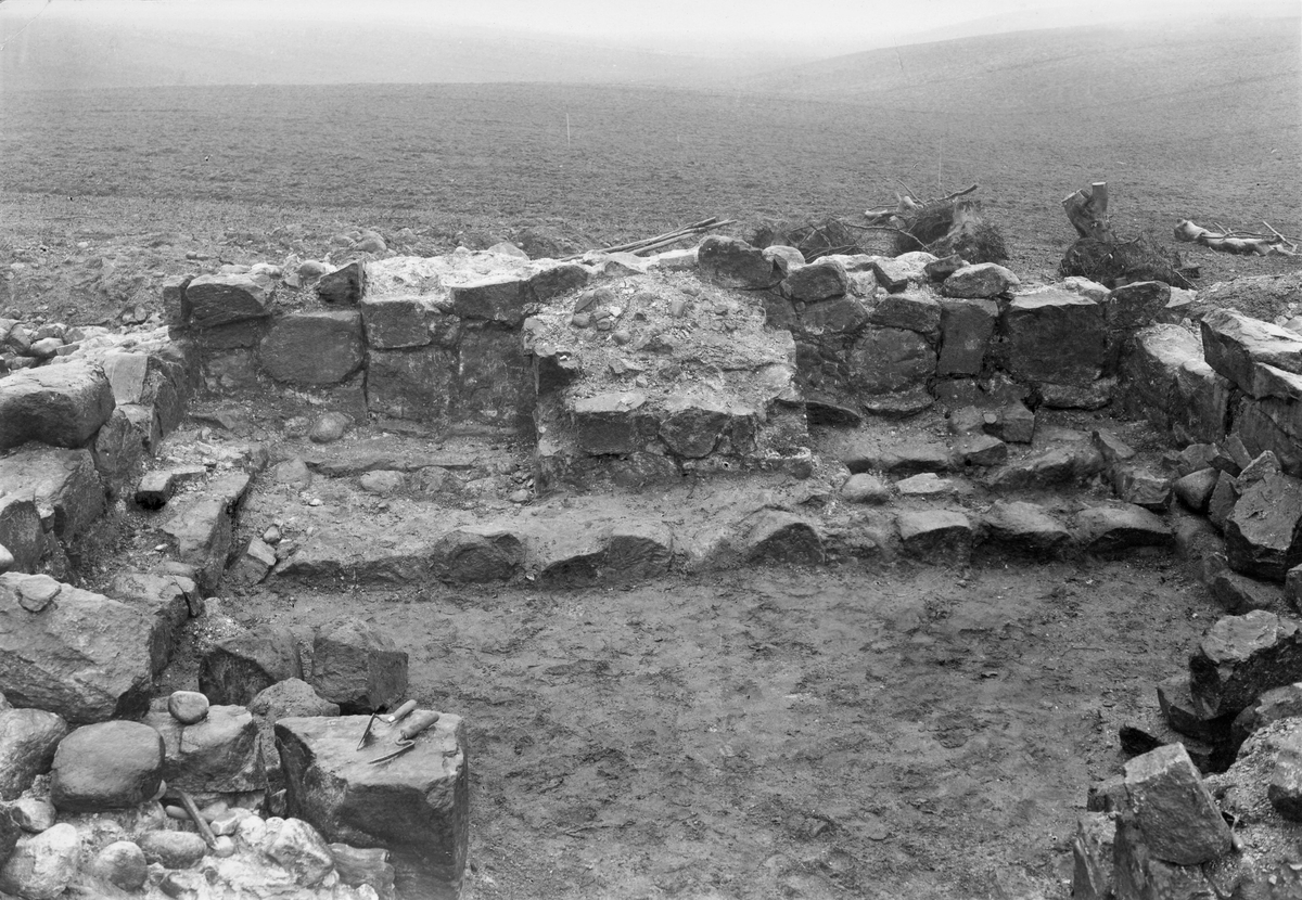 Övraby kyrkoruin, korets inre sett från väster. I mitten ses altarets fundament och nere till vänster ligger ett par av arkeologernas verktyg. Bilden är sannolikt tagen när ruinen grävdes ut av arkeologer i mitten av 1930-talet. Arbetet leddes av landsantikvarie Erik Salvén. 1978 utfördes en utgrävning av arkeolog Jan-Erik Augustsson. Platsen ligger ovanför forsen vid Slottsmöllan i Halmstad, nära stadsdelen Kärleken. Övraby var föregångaren till dagens Halmstad. (Se även bildnr F9229)