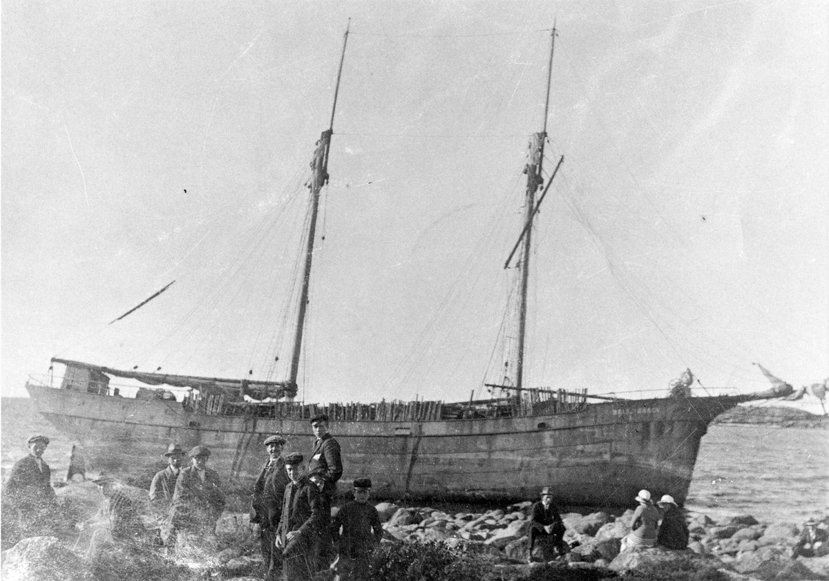Skonaren Billy Brack i Glassvik, Steninge.. På stranden har ett gäng unga gossar samlats och till höger sitter en man och två kvinnor på stenarna.
