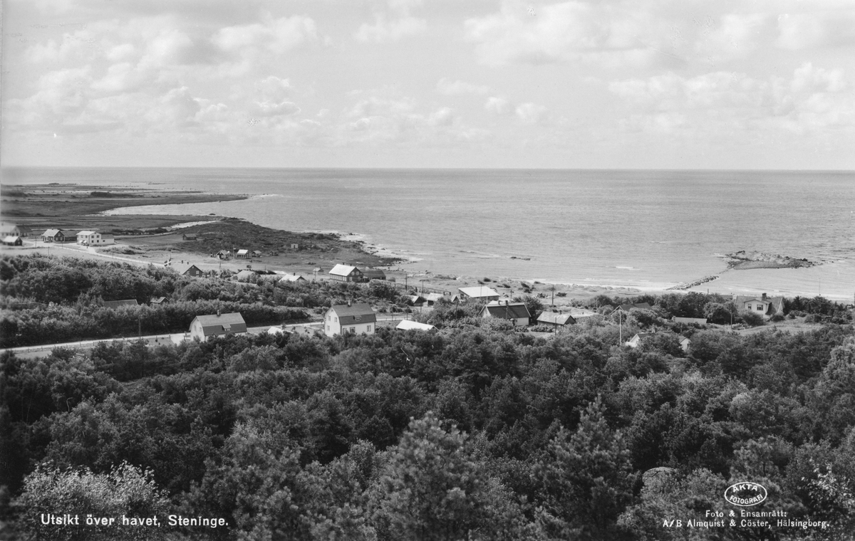 Vykort, " Utsikt över havet, Steninge." Flygfoto över Steninge strand och dess bebyggelse. (Se även bildnr F9216)