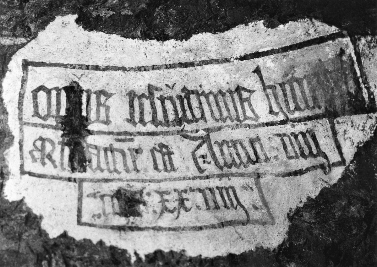 Detalj av inskription på latin i Söndrums kyrka som påträffades i valvet ovanför predikstolen. Texten är skriven över tre inramade rader.