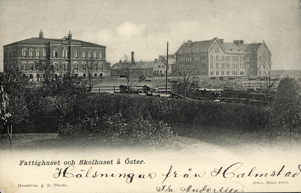 Brevkort, "Fattighuset och Skolhuset å Öster. Mellan järnvägsstationen och Nissans östra strand växte en av Halmstads äldre stadsdelar fram i början av 1900-talet. Den begränsas av Strandgatan, Stationsgatan och Viktoriagatan och kallas idag Östra förstaden.