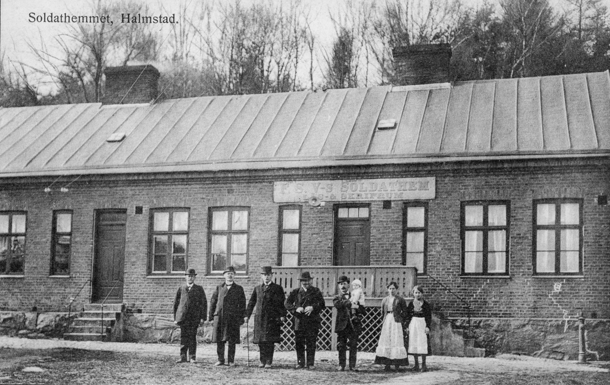 Vykort, "Soldathemmet, Halmstad." Fem herrar, varav en håller ett litet barn, samt två unga flickor i förkläden står, enligt fasadskylten ovanför dörren, framför F. S. V-s Soldathems Läs- & skrifrum.