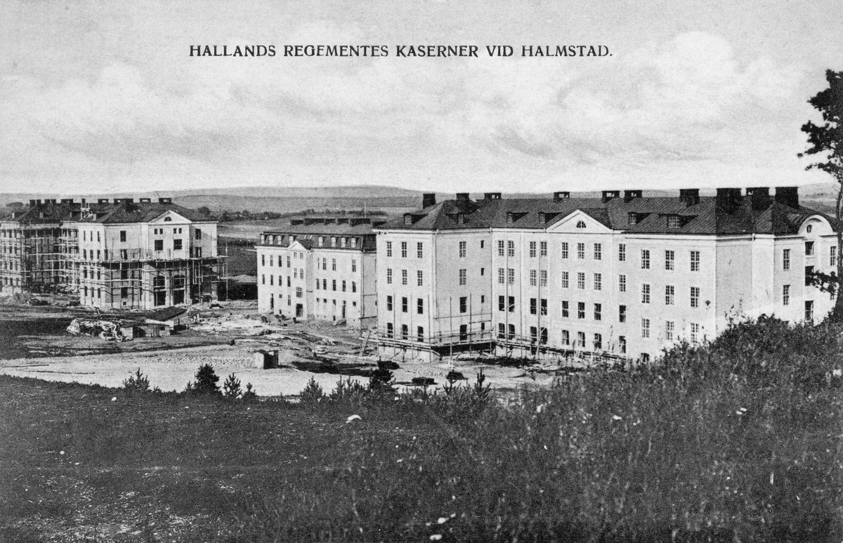 Brevkort, "Hallands Regementes kaserner vid Halmstad.", daterat nyårsafton 1905. Bilden visar kasernerna för Hallands regemente I16 under uppbyggnad. Anläggningen stod klar 1906 men invigdes inte förrän i oktober 1907.