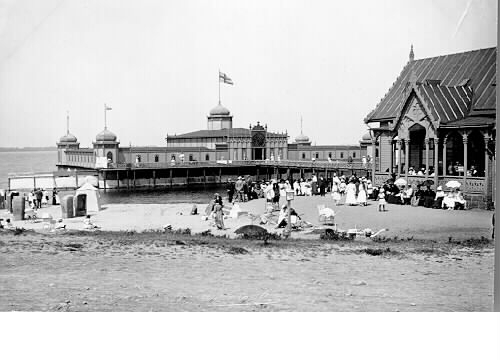 Badgäster vid badhusen i Varberg; varmbadhuset till höger och kallbadhuset ute i vattnet. Bilden tagen mot väster ca 1915.
