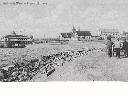 Vykort, "Kall- och Warmbadhuset, Warberg." Kallbadhuset till vänster, varmbadhuset och tullhuset längst till höger. Tre män med dragkärra går på strandpromenaden. Vykortet är postat 1909.