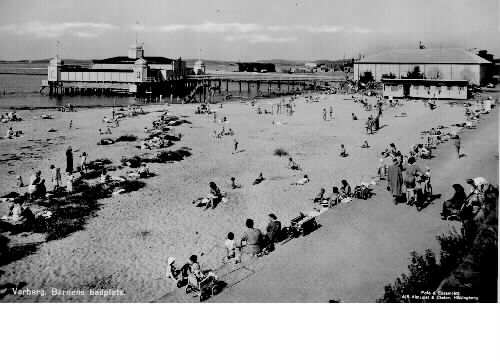 Vykort, "Varberg. Barnens badplats". Stranden med Strandpromenaden till höger och Kallbadhuset uppe till vänster. Varmbadhuset har numera gett plats åt ett magasin till höger i bild.