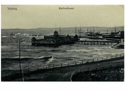 Vykort, "Warberg. Kallbadhuset". Blåsig väder med kallbadhuset byggt 1903 till vänster, varmbadhuset till höger och hamnen däremellan. Tidigt 1900-tal.