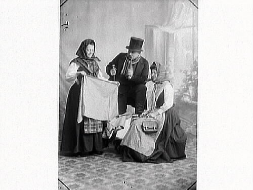 Tablå som föreställer en knalle som försöker sälja tyg till två damer. Han bär hög hatt käpp/stav samt håller i en lång pipa. Mannen är Elof Ernwald, damen till höger är Hulda Lindh (f Ranch). (Jämför foto MR2_984 o 985)