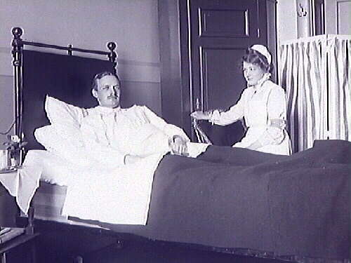 Sjukvård. Sjuksyster med manlig patient i sjuksäng på Varbergs dåvarande länslasarett.