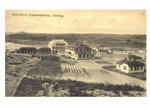 Vykort, "Apelvikens Kustsanatorium, Varberg." Framför byggnaderna ser det ut som odlingar anlagts.
