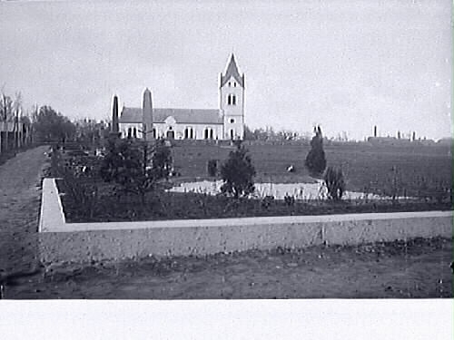 Tvååkers kyrka i Halland. I förgrunden en låg, putsad mur och längs uppfarten till kyrkan står två gravstenar i form av obelisker.