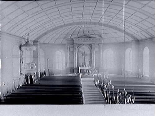 Interiörbild av Värö kyrka, vy från läktaren mot koret. Altargång, altarring, altaruppsats, predikstol, kyrkbänkar. Flackt välvt tak indelat i rutmönster. (Se även bild MR2_569)