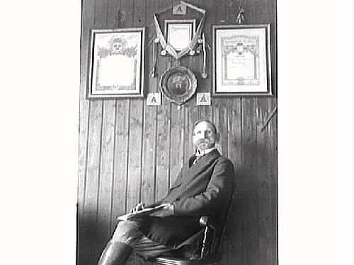 En äldre man sitter invid en trävägg där det hänger diplom för hästuppfödning och andra utmärkelser. T v, Allmänna svenska lantbruksmötet i Örebro 1911; längst t h Hallands läns hushållningssällskap 100-års jubileum; överst i mitten "Afvelsdiplom"; underst i mitten "...för svenska ardenner".
