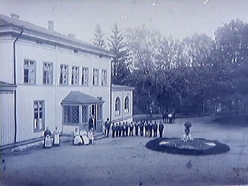 Skyddshemmet Mäshult i Skällinge. Uppfostringsanstalt för vanartiga gossar. På gården syns personal och troligen intagna pojkar.