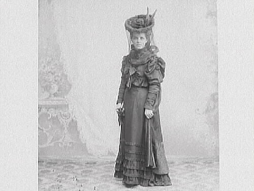Fotografen själv i helfigur, iklädd puffärmad klänning och en ringlad hatt med fjädrar och lång slöja runtom.