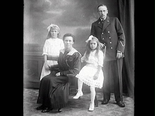 Familjebild. Lots Gustaf Färdig (f. 1874) med sin familj: hustrun Edla Färdig samt barnen, från vänster Gunhild Färdig (f. 1908) och Vega Färdig. Gustaf var född Bengtsson i Tvååker och var först sjöman. 1928 upphörde Gustaf med lotsyrket och de flyttade till Öland, varifrån Edla kom, men flyttade senare tillbaka till Varberg.