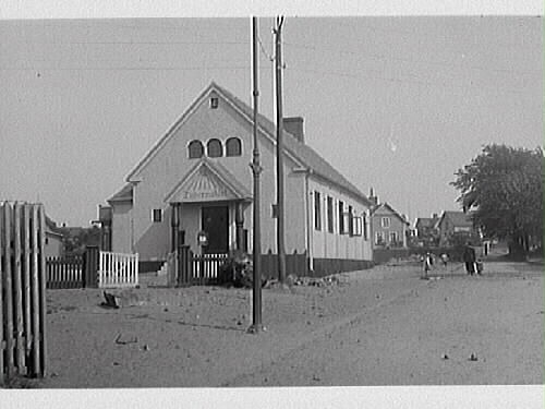Varbergs Baptistförsamlings kyrka, Tabernaklet, som ligger utmed Skansgatan, kv Kaninen 1. Den solitära byggnadens ena gavel är vänd mot kameran och uppvisar en stilblandning av olika arkitektoniska stilelement: runda pelare med ansvällning upptill, som bär ett tresidigt skärmtak över entrén, och däröver tre välvda, småspröjsade fönster med pilastrar emellan. Frontonen är dekorerad med solstrålar och texten "Tabernaklet". Från husgaveln går ett staket med vitmålad grind i höjd med entrén.