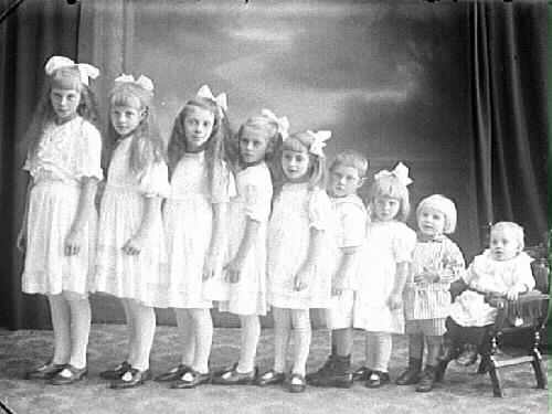 Nio syskon uppställda på rad med minstingen sittande i en barnstol.