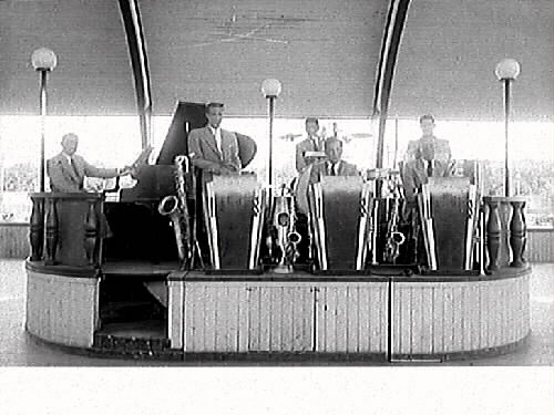 Jazzorkester poserar på utomhusdansbanans scen i Nöjesparken. Framtill står saxofoner.