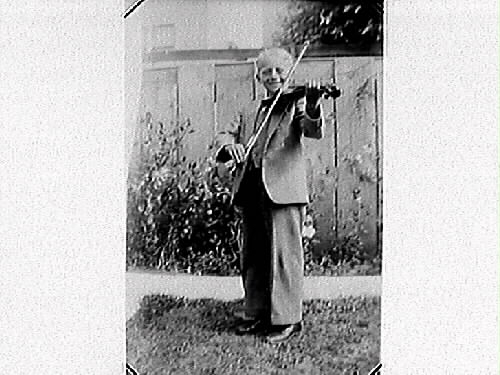 Liten pojke i kostym står leende i en trädgård och spelar fiol.