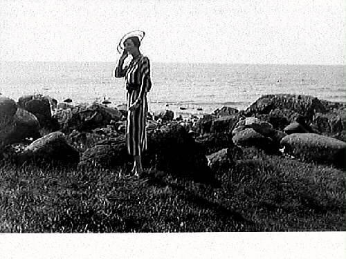 En medelålders kvinna klädd i randig klänning och en genomskinlig hatt med två svarta kantcirklar står på stranden vid badplatsen Djupa dräkt i Apelviken. Bild 2 visar närbild på kvinnan och hatten.