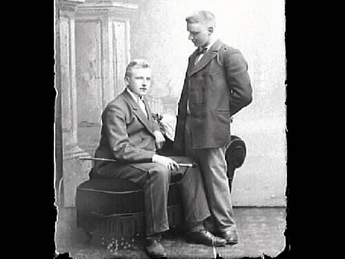 Ateljébild av Mathildas bror Wilhelm Ranch som står vid sittande Elof Ernwald. Elof kom som biträde till Mathildas ateljé 1894 som tjugoåring. Wilhelm var sex år äldre och ynglingarna blev goda vänner. Elof blev själv fotograf och övertog firman formellt 1922.