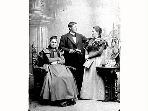 Ateljébild av tre vuxna personer. Fotografens mor Theresia Ranch, sittande till vänster, tilsammans med en av sönerna och en av döttrarna. Han håller en blomma och hon en bok.