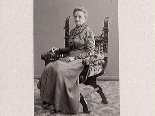 Kvinnoporträtt. Gammal kvinna sitter i en tronliknande stol.